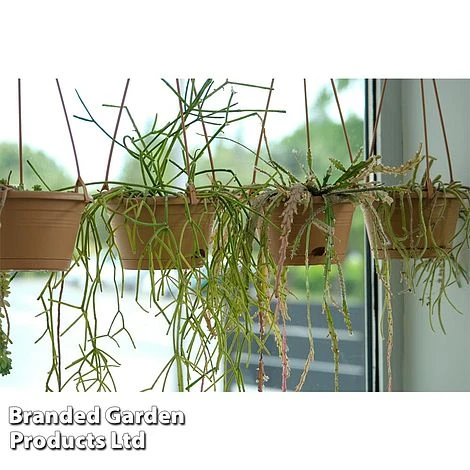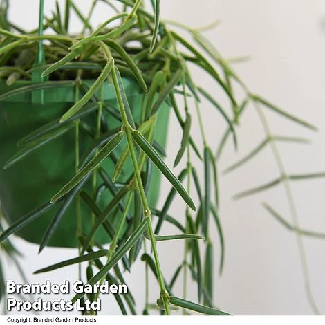 Producing a waterfall of tropical foliage, Hoya linearis makes a fantastic hanging houseplant for a bright kitchen, bathroom or high-ceilinged room. The cascading stems of slender leaves may tumble for a metre or more, making an unusual feature that creates a sense of calm. Given enough light, clusters of waxy, sweetly scented cream flowers may be produced. Height: 100cm (39in). Spread: 30cm (12in).